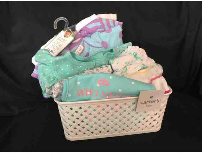 this is a small basket full of layette items for a baby girl sized 0-6 months.