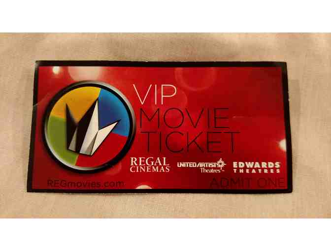 Up for auction is this movie ticket from Regal Cinemas. It is a red VIP movie ticket. It can also be used at United Artists and Edwards Theatres.