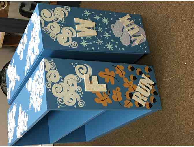 Reading in Every Season is the artistic theme for this delightful pair of companion bookcases that will be used at the house to support the reading enjoyment of the moms and babies. These gently used sturdy bookcases have been painted by Mary Jennings, designed to represent the four seasons and the wonder of reading in each one.