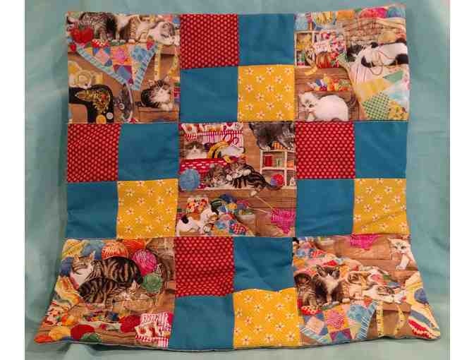 This catnip mat measures approximately 17.5” x 17” and features corner and center square patches with kittens in yarn/sewing supplies. 8 teal blue squares, 4 red print squares, 4 yellow print squares with white flowers and dots. The back is grey with white squares. Easy access to the plastic bag with catnip via a Velcro opening in the back. Machine washable. Lovingly handcrafted by Phyllis McCurdy.