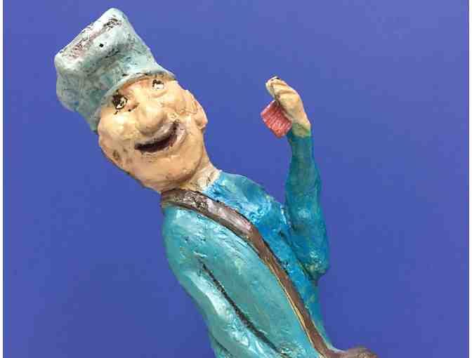The Postman was carved by a local artist named Don Smith. This is one of his favorite pieces of artwork. It took over 50 hours of hand carving to create this masterpiece. The base is cedar wood and the Postman is rose root.