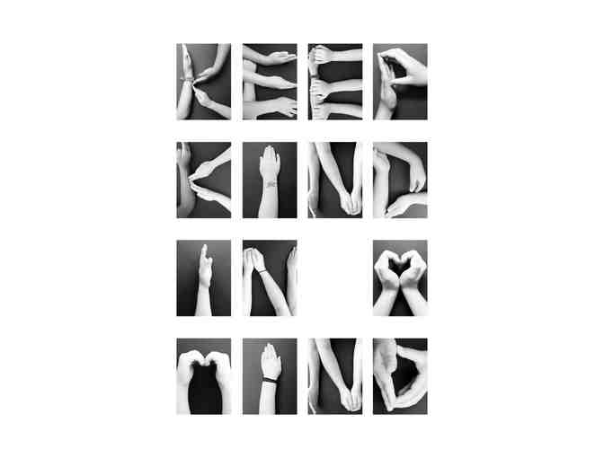 A photo montage on canvas by Laurence parent and fine art/editorial photographer Tracy Gitnick Herriott showing the hands of kindergarten students intertwined to spell "Keep Kind in Mind."