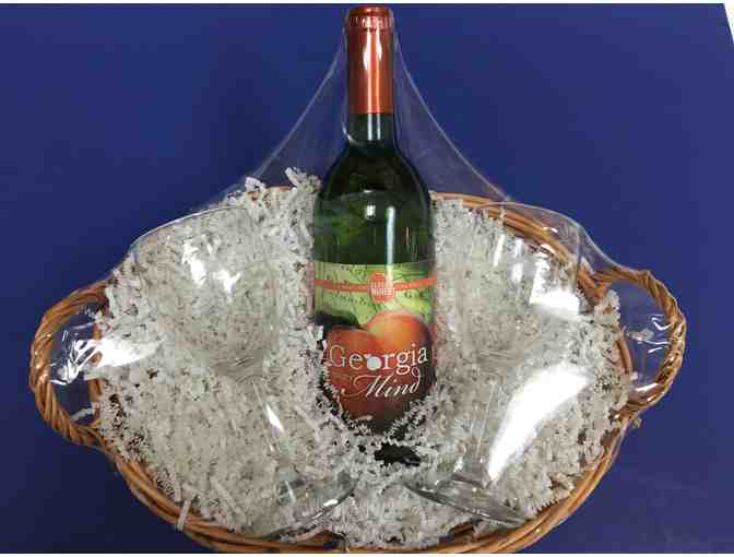 Bid on this beautiful wine basket filled with 2 wine glasses and a bottle of Georgia on my Mind wine. This wine is a heavenly blend of two of Georgia's finest fruits, juicy white grapes and velvety peaches! Nutured by the Georgia sun and hand-picked with Southern pride, the irresistibly enchanting wine is celebrated as Georgia Winery's most awarded wine.