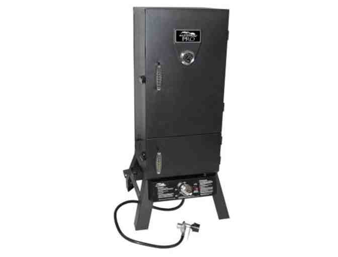 4 smoking racks provide a total of 717 sq. in. of cooking area. Cool Touch side handles. 15,400 BTU stainless steel burner. Type 1 regulator with hose.