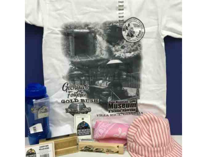 The basket includes Four Tickets (Museum, Panning, Trails), engineer hat, bandana, train whistle, railroad spike, water bottle, gold museum key chain, patch, and t-shirt.