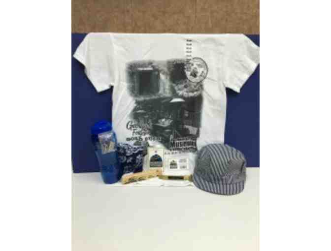 The basket includes Four Tickets (Museum, Panning, Trails), engineer hat, bandana, train whistle, railroad spike, water bottle, gold museum key chain, patch, and t-shirt.