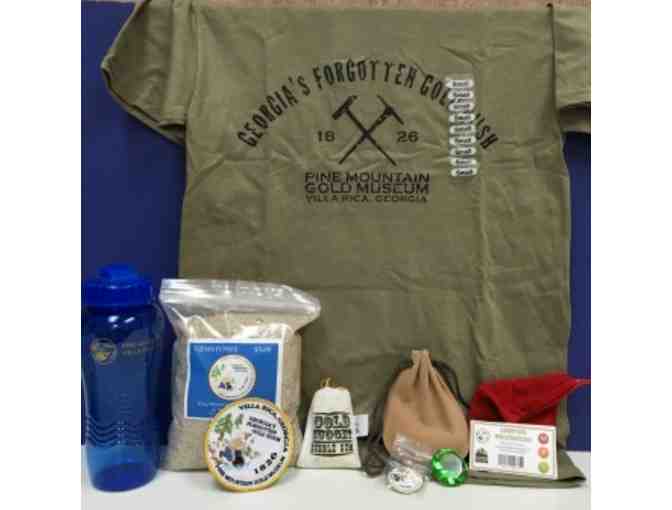 The basket includes Four Tickets (Museum, Panning, Trails), Gemstones in a leatherpouch, vials of gold in a leather bag, gold nugget gum, diamond shaped crystal, water bottle, gold museum key chain, patch, and t-shirt.