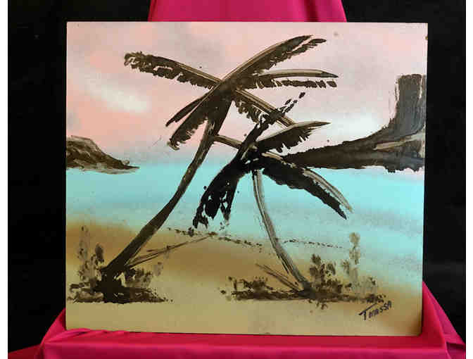 "Fantaseas" is a beautiful painting of a tropical scene by blind artist Thomas Massa. Unframed size is 16"x14".