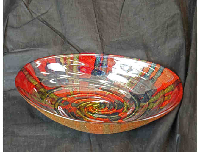 Gorgeous glass bowl with bursts of color and frosted underside. Measures 12 1/2" x 8 3/4".