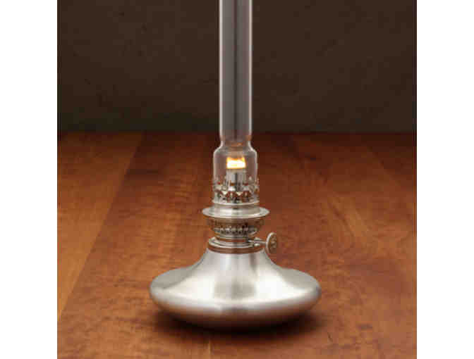 A Danforth Pewter Classic, the Mariner pewter oil lamp was designed with a wide, stable base like a ship's decanter. The sleek and elegant sheen of our meticulous satin finish glows warmly even without the flame. Designed for function, our burners and chimneys are the highest quality. We suggest using scentless lamp oil. Holds 20 ounces and is 14" high with chimney. 6" diameter, 2 3/4" high (without burner). Comes in a gift box. Care card includes instructions and brief Danforth story. Oil burns at approximately 3 hours per ounce (based on our smokeless liquid parafin oil.)