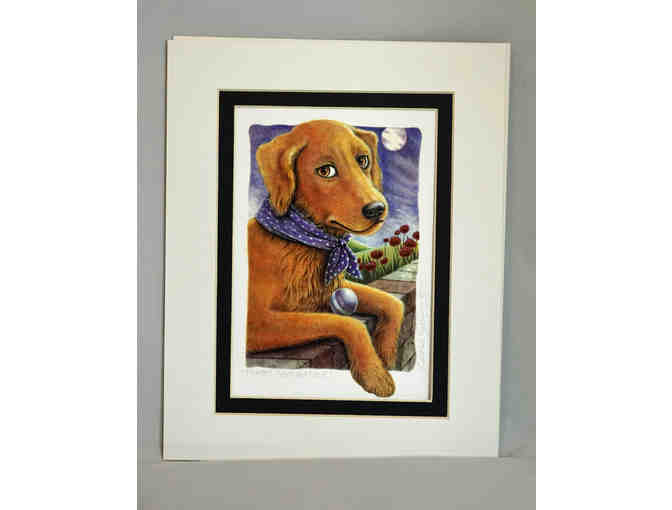 "Flowers, Fetch and Fun II" print by Laura Seeley featuring a golden. Signed.