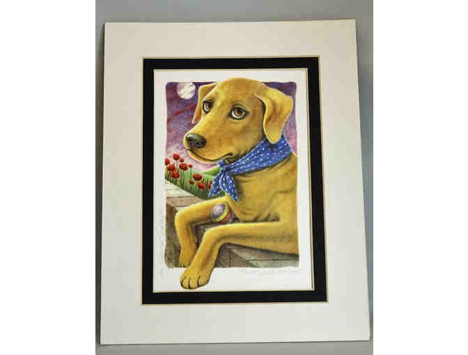 "Flowers, Fetch and Fun III" print by Laura Seeley featuring a yellow labbie. signed.