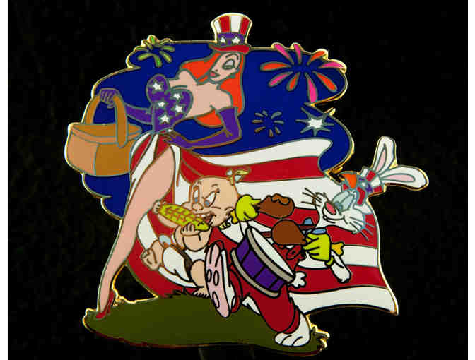 DA description reads: Roger and Jessica Rabbit join with Baby Herman in an updated homage to the Spirit of '76 on this striking gold-finished character pin, a Disney Auctions exclusive in a limited edition of 100 oversize pins and one in a series featuring our favorite characters at an Independence Day barbecue.