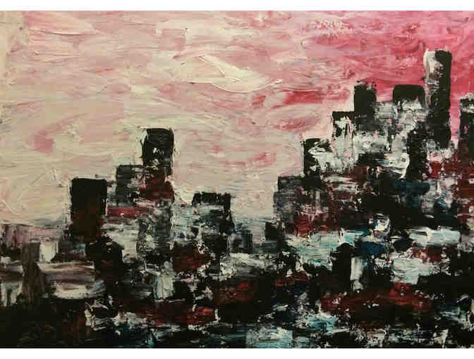 City on a hill is a celebration of several cityscapes seen by the artist during her travels domestically and abroad. Elements of cities in France, Italy, and her hometown of Boston can be found within this interesting landscape. The artist enjoys experimenting with color and texture; both work together to complete this one of a kind piece.