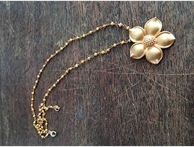 Deborah Halperin is known for her jewelry designs in vermeil. This special necklace has a gold-plated brass flower pendant dangling from a 14K vermeil and seed pearl chain.