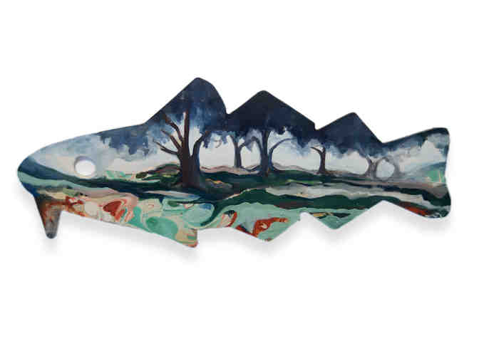 Artist Statement:  This mixed-media painted cod features collaged Turkish marbled paper, handmade by Jacome. The painting depicts a treescape and the swirling details of the roots.
