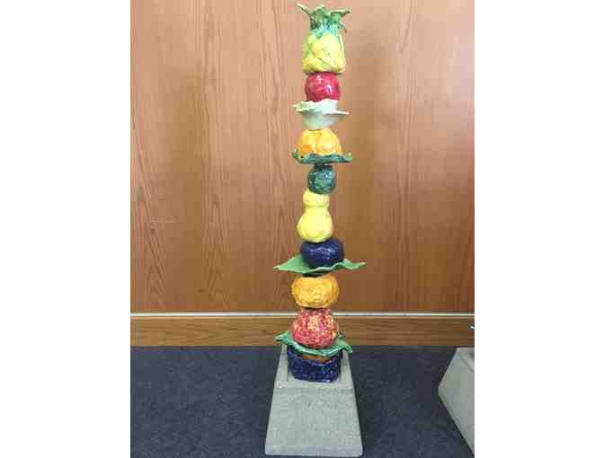 Garden totems are one of the Art Masterpiece projects made by 3rd grade students in Kim Ponza's class at SLV Elementary School. These totems are inspired by a lesson on Barbara Hepworth, an English artist and sculptor. Her work exemplified Modernism and in particular modern sculpture. Students created brightly colored ceramic pieces celebrating nutritious fruit and vegetables. These ceramic pieces were then stacked vertically on metal poles and secured to cement bases to create three separate totems. Each totem represents a proud collaboration of all the students in Mrs. Ponza's class. Designed to be safe outdoors, they will make absolutely beautiful sculptural focal points in any garden!11"x 11" cement base, 48" tall