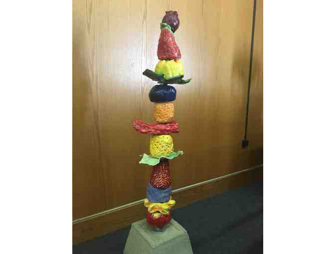 Garden totems are one of the Art Masterpiece projects made by 3rd grade students in Kim Ponza's class at SLV Elementary School. These totems are inspired by a lesson on Barbara Hepworth, an English artist and sculptor. Her work exemplified Modernism and in particular modern sculpture. Students created brightly colored ceramic pieces celebrating nutritious fruit and vegetables. These ceramic pieces were then stacked vertically on metal poles and secured to cement bases to create three separate totems. Each totem represents a proud collaboration of all the students in Mrs. Ponza's class. Designed to be safe outdoors, they will make absolutely beautiful sculptural focal points in any garden!11"x 11" cement base, 51" tall
