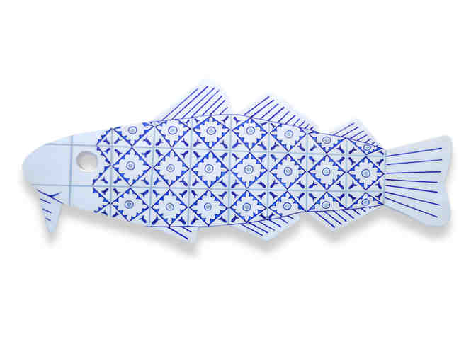 Artist Statement:  I am a fan of the Marblehead Festival of Arts and was happy to be invited to decorate a codfish again this year. This year my project is inspired by Portugal, where I have seen codfish (bacalhau) listed on every menu. The patterns on my fish are inspired by Portuguese blue and white tiles (azulejos), and are designed to look like fish scales and markings as well as tiles—a kind of visual pun. I named my fish "Bela Bacalhau."