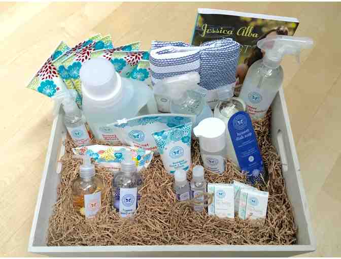 Bundle of Honest Company products includes: Laundry detergent, Oxy Boost, Dryer Cloths, Multi-surface Cleaner, Glass Cleaner, 10 count wipes x5, Dish Soap, Dish Towels, Suds Up Dish Scrubber, Hand Soaps x2, Hand Sanitizer (travel size) x2, Shampoo and Body Wash, Face and Body Lotion, Lip Balm Trio, and the book The Honest Life written by Jessica Alba.