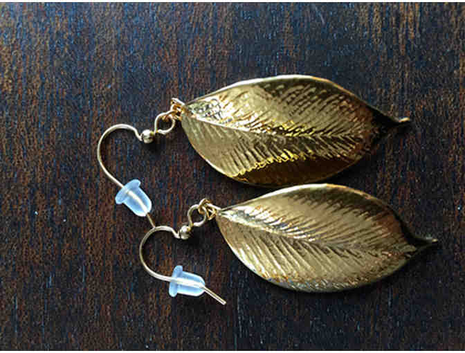 At Alyxia Leaf, makers of jewelry and curios, careful attention is taken to preserve the unique characteristics of each treasure from nature, down to its atomic detail, and no piece is the same. During the electroforming process, a fine layer of metal is bonded to carefully selected natural objects from all over the U.S. and Australia. These earrings made with Australian Alyxia leaves, from which the company takes its name, are 1 inches long. For more information go to http://www.alyxialeaf.com/jewelry/5/Alyxia-Gold-Earrings.htm