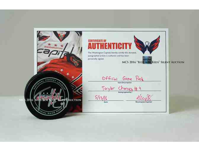 *Includes official game puck authorized by #4 Taylor Chorney and Certificate of Authenticity whereby the Washington Capitals certify that this donated, autographed article is authentic and has been personally signed.