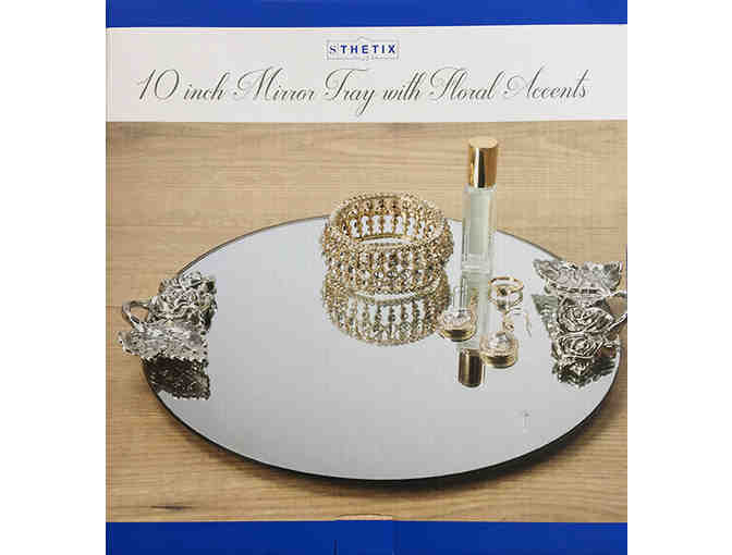 10-inch mirror tray with floral accents. For decorative use, perfect for vanity tops.