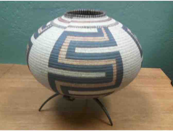 This ceramic piece imitates a Desert Cahuilla-fashioned basket originally collected and then reproduced in clay by David Salk. Incredible detail in texture and design - 'woven' design colors are glazed, not painted! Comes with a hand-forged stand made of three vintage nails.