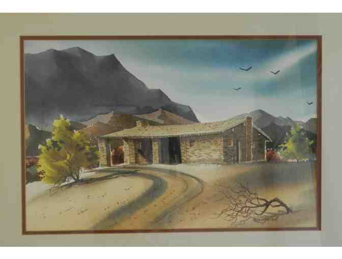 California painter Albert Blaisdell, a gold medal winner in the 2006 National Veteran's Creative Arts Festival at age 87, was a frequent contributor to Borrego art shows in the 1990s. This painting of the Old Vallecito Stage Station is matted and framed (29" x 22") and conveys a nostalgic desert mood. Neutral mat and walnut wood frame.