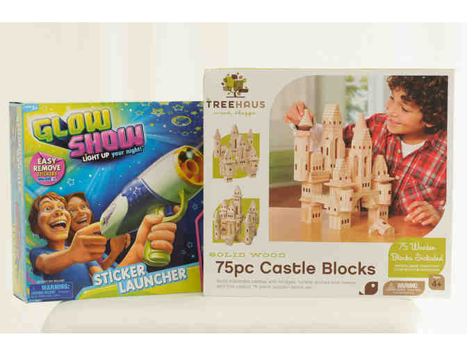 Toys - Glow Show Sticker Launcher and Solid-Wood 75-piece Castle Blocks