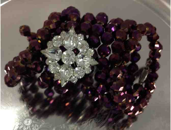 Designer style bracelet with faceted eggplant beads and antique rhinestone button.