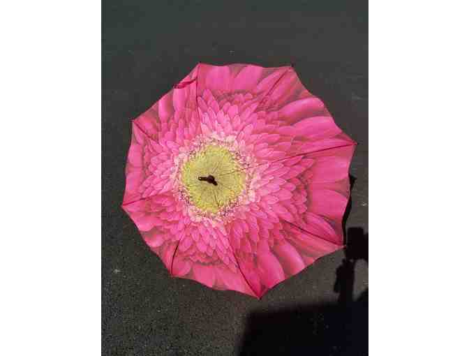 Rainy days don’t have to be gray with this large and colorful pink flower umbrella.