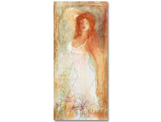 Magal's simple calligraphic drawing of the female form or a flower-filled vase is the foundation of her personal style that she puts into her work. To these, the brilliant washes of lively colors act as a counterpoint, with the deeper and warmer hues evoking the luminosity of medieval stained-glass windows.