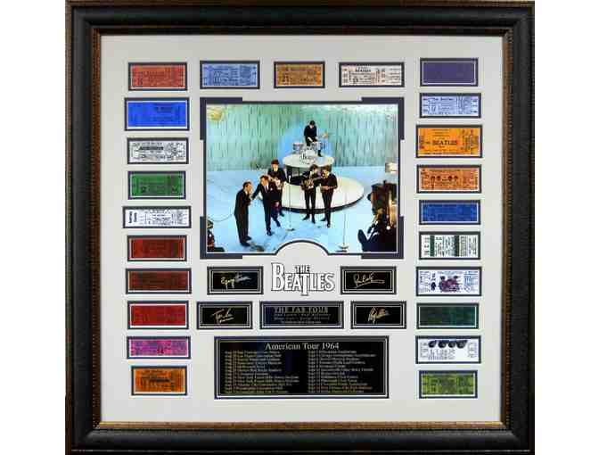 In 1964, the Beatles crossed the pond during the midst of the American rock-and-roll revolution, and set the world on fire. Commemorate that leap for one of the most famous music groups of all time with this handsomely packaged Replica Ticket collection from the Fab Four's first American tour. In the center of the display is an image from the Beatles' first appearance on the Ed Sullivan Show, Replica Signature plates from each member of the band and an engraved plate listing all the stops on the 1964 American Tour. 32 W x 34 H.