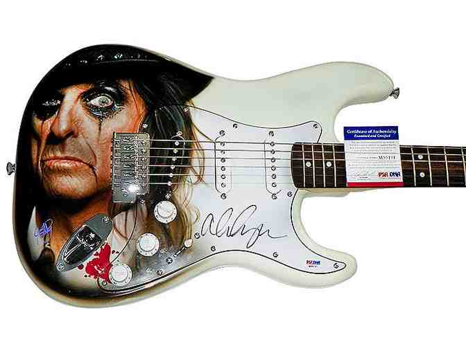 This is an electric guitar with custom airbrush artwork and is also been hand signed in person by Alice Cooper. A Certificate Of Authenticity will be included from UACC Registered Dealer #237 / 2011 UACC Autograph Dealer Of The Year! In addition to our own certification this item has been examined and certified authentic by PSA/DNA and features their tamper resistant PSA/DNA sticker with unique # which can be looked up on their website for confirmation. The PSA/DNA # is:M99101
