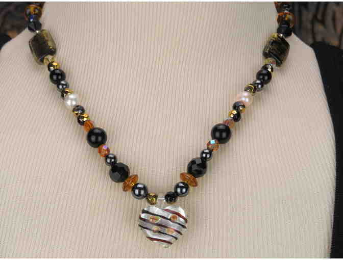 - FEATURES: IRRIDESCENT LINES AND DOT BEADS W/ BLACK ONYX AND IRRIDESCENT LAMPWORK HEART PENDANT DROP