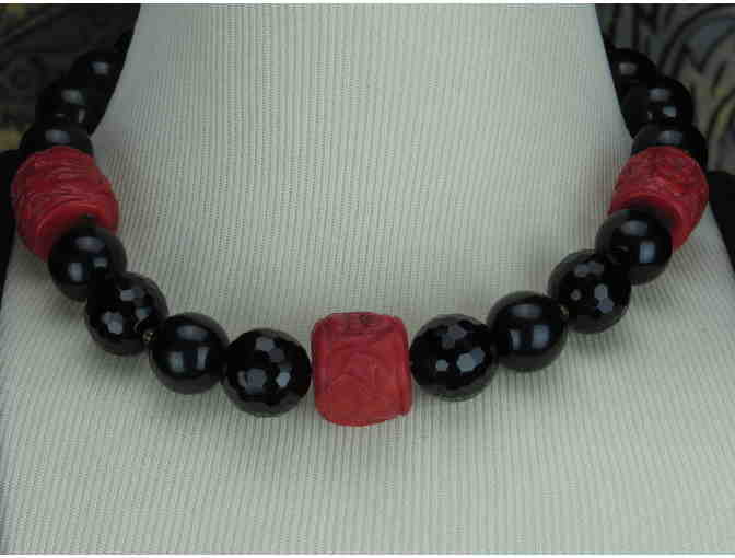 Absolutely DIVINE Necklace features 3 Carved Cinnabar Focals, Genuine Black Onyx!