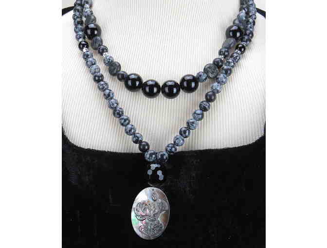 Snowflake Obsidian, Onyx and Paua Sheel featured in this1/KIND GEMSTONE NECKLACE #334