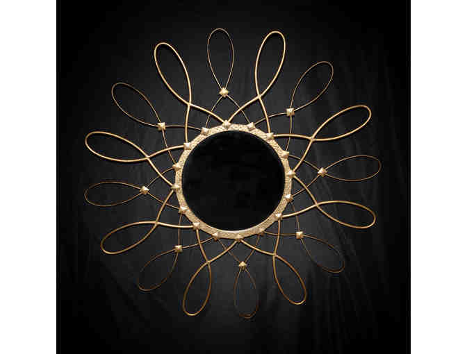 Beautiful wall mirror that will highlight and brighten any room. Gold ornamental design encompasses the mirror and will look great hanging over an accent piece of furniture in the living room or dining room. Or, it will look great as wall art outside in the sunroom.