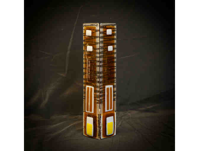 This is a one-of-a-kind! Two amber glass panels sandblasted & fused together on a concrete base with candle holder hole. Great for decorating a formal dining table or just to sit atop on an acent table. Donated by: Pearl River Glass Studio or call 601-353-2497.