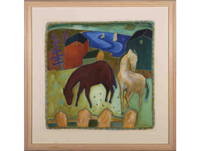 Mary Bourke lives in mid coast Maine; her work has been featured in numerous publications including on the cover of Down East Magazine, in Maine Boats, Homes & Harbors magazine, and the L.L. Bean Catalog. Acrylic on paper. Image 22 ¼” x 22 ¼”; framed 30 ½” x 30 ½”. Donated by Sheila Bodine