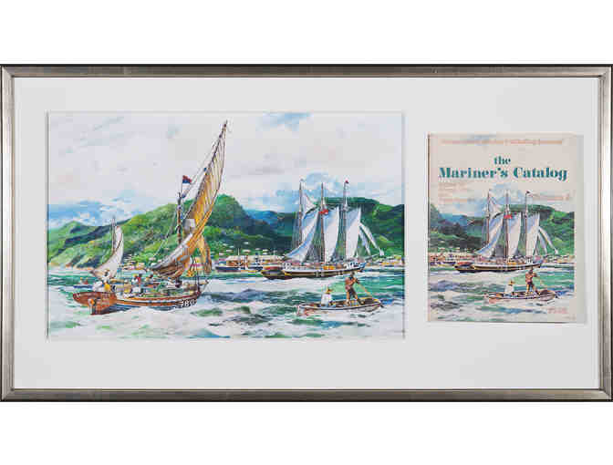 Darrell McClure (1903 - 1984) was an American cartoonist and illustrator best known for his work on the comic strip Little Annie Rooney. His work is in private collections and museums, including the Maritime Museum in the San Francisco Maritime National Historical Park. The Mariner’s Catalog contains information about boats, boating, boat design, gear and supplies, and all things maritime. Volume 6 was edited by Peter Spectre and George Putz and published on May 26, 1979. Image 12 ¾” x 23 ¾”; framed 19” x 35 ¼”, with painting and catalog included in frame.