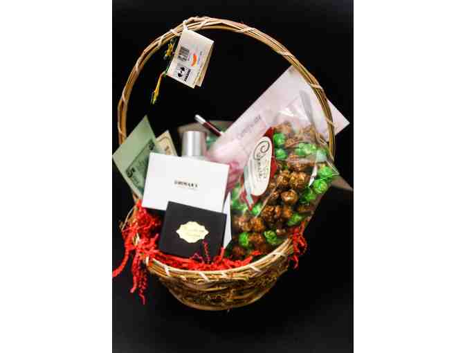 Give the gift of local flavor! This deluxe gift basket includes delicious popcorn from Cashmere Gourmet Popcorn, $20 for HHB Barbeque, $5 for Lupita's Mexican Restaurant, $5 for Moburts Spices and More, $25 for fresh flowers from Absolute Design by Brenda, sterling silver knot earrings and a free watch battery from Briman's Leading Jewelers, pearl earrings from David's Jewelers, and MUCH MORE! Support local with this great gift basket.