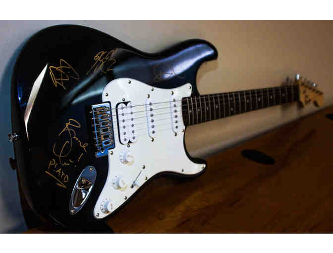 Fender guitar signed by members of the double platinum pop-rock band Panic! At the Disco, including Brendon Urie! Signatures are prominent in gold and include the band's P!ATD emblem.