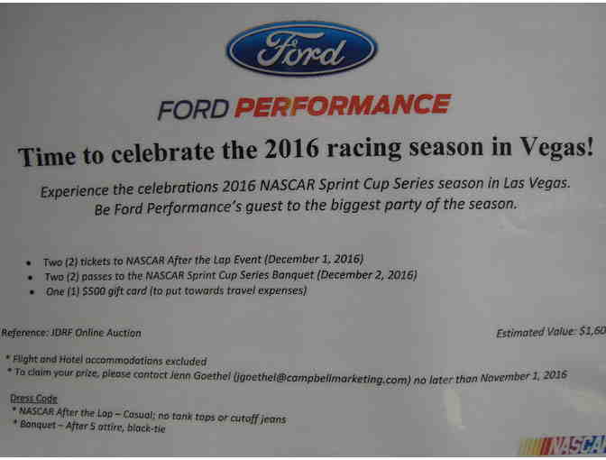 2016 NASCAR Sprint Cup Series Celebration in Las Vegas. Includes: Two (2) tickets to the NASCAR After the Lap Event (December 1, 2016), Two (2) passes to the NASCAR Sprint Cup Series Banquet (December 2, 2016) & One (1) $500 gift card (to put towards travel expenses). Flight and hotel accommodations excluded.