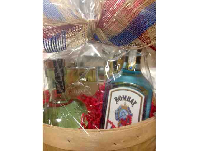 Liquor Gift Basket featuring one bottle of Bombay Sapphire Gin, one bottle of Bacardi Gvan Reserve Rum, one bottle of Corzo Tequila and one bottle of St. Germain Liquor.