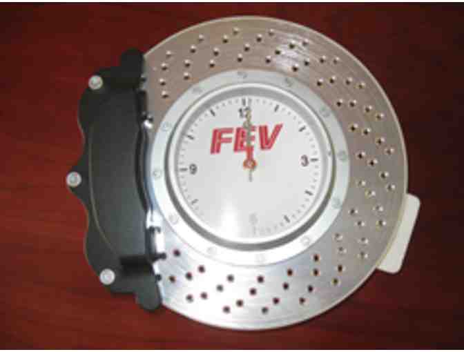 13" diameter wall clock. Disc brake construction. Aluminum rotor design with through-holes and caliper in black. FEV - Full Electric Vehicle Logo on clock face. Ths very unique clock will make any man cave or office "Stand Out". Plastic design material