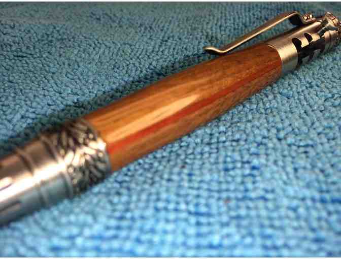 This custom antique pewter pen was used to autograph a 5X7 photo of the new Ford F-150 Raptor signed by Edsel B. Ford II.  It was made by a Ford engineer.  The center section of the pen contains wood from the 2nd floor of the “mahogany row” office section of the historic 1924 Ford Engineering Laboratory Building, and the thin strip of rose colored wood came from a storm damaged Bradford pear tree on Ford property.  The pen comes in a box with the autographed photo.