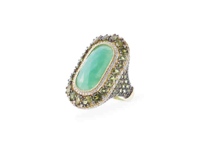 The Dorsay collection was inspired by Judith Ripka's admiration for the spectacular Musee d'Orsay in Paris. This 18-karat gold ring features a spectacular, 6.50ct oval chysoprase center with a fine micro pave bezel surrounded by round and oval green tourmalines and an outer bezel of diamond pave. The shank of the ring is also encrusted with pave green tourmaline. It has a total of 5.59cts in green tourmalines and 1.97cts of diamonds. This ring is a size 7.