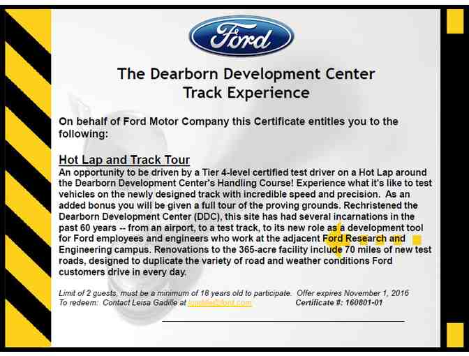 Limit of 2 guests, must be a minimum of 18 years old to participate. Offer expires November 1, 2016 To redeem: Contact Leisa Gadille at lgadille@ford.com